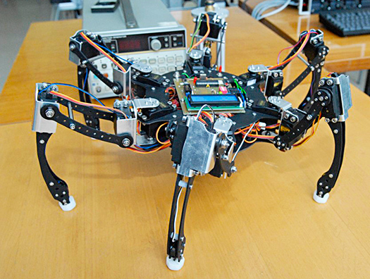 Roboty kroczące mogą być wykorzystywane do badania niedostępnych dla człowieka terenów. Docierają tam gdzie nie radzą sobie urządzenia kołowe czy gąsienicowe. Mogą być wykorzystywane do mapowania terenu, czy badania zagrożonych obszarów. TriHex, powstał w ramach pracy inżynierskiej dwóch studentów AGH. Waży prawie trzy kilogramy, zbudowany jest z około pięćdziesięciu elementów (w tym w osiemnaście napędów) i porusza się w sposób trójpodporowy. Można nim sterować za pomocą komputera lub telefonu komórkowego i protokołu bluetooth, dzięki aplikacji stworzonej także w ramach pracy inżynierskiej. Wszystkie elementy które wchodzą w skład robota, z wyjątkiem napędów i części katalogowych, zostały zaprojektowane i wykonane w Katedrze Robotyki i Mechatroniki oraz przy udziale firm zewnętrznych. Marek Niewiadomski opracował układ sterowania robotem kroczącym sześcionożnym, podczas gdy Jakub Oleś zajął się konstrukcją mechaniczną robota. - W pracy inżynierskiej byłem odpowiedzialny także za opracowanie trajektorii ruchu robota. Jest to złożone zadanie, ponieważ robot ma sześć nóg i aż osiemnaście napędów - wyjaśnia Jakub Oleś. Drugi z współautorów pracy, Marek Niewiadomski, opracował część informatyczną oraz algorytm chodu i elektronikę, w którą wyposażony jest robot. Prace nad nim trwały sześć miesięcy, w tym czasie adepci robotyki i mechatroniki projektowali, testowali oraz przygotowywali elementy składowe. Konstrukcja mechaniczna oraz elementy nóg wykonane są z tworzywa epoksydowego i aluminium. - TriHex ma kolisty kształt korpusu oraz sześć równomiernie rozmieszczonych nóg. Dzięki takiemu układowi możliwe jest definiowanie jego chodu w dowolnym kierunku. W praktyce oznacza to, że nasz robot nie ma ani przodu ani tyłu. Dzięki temu nie ma konieczności odwracania go, jeśli chcemy zadać mu inny kierunek ruchu - wyjaśnia współautor Jakub Oleś. Odnóża wyposażone w czujniki podłoża służą do poruszania się po terenie nierównomiernym i różnorodnie ukształtowanym. Dzięki czujnikom robot może wspinać się i schodzić po niewielkich schodach. Oprócz czujników odnóża zawierają element silikonowy stykający się z podłożem, który tłumi uderzenia o grunt, a także uniemożliwia poślizg. W urządzeniu zastosowano baterie o pojemności 4400 miliamperogodzin [mAh] dzięki czemu TriHex może pracować bez przerwy do czterdziestu minut.